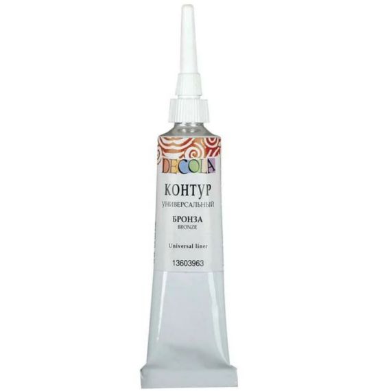 Контуры универсальные «Decola» изготавливаются на основе водной акриловой дисперсии. Широко используются для создания декоративных эффектов при работе с мелкими деталями и объемными рисунками. Применяются на различных поверхностях, таких как дерево, фарфор, стекло, металл, ткань, холст. Не позволяют краскам смешиваться друг с другом, что помогает создать чёткие границы.