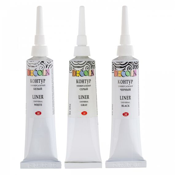 Универсальные контуры Decola изготавливаются на основе водной акриловой дисперсии. Широко используются для создания декоративных эффектов при работе с мелкими деталями и объемными рисунками. Применяются на различных поверхностях, таких как дерево, фарфор, стекло, металл, ткань, холст. Не позволяют краскам смешиваться друг с другом, что помогает создать чёткие границы.