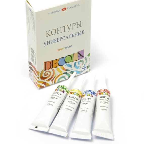 Универсальные контуры «Decola» изготавливаются на основе водной акриловой дисперсии. Широко используются для создания декоративных эффектов при работе с мелкими деталями и объемными рисунками. Применяются на различных поверхностях, таких как дерево, фарфор, стекло, металл, ткань, холст. Не позволяют краскам смешиваться друг с другом, что помогает создать чёткие границы.
