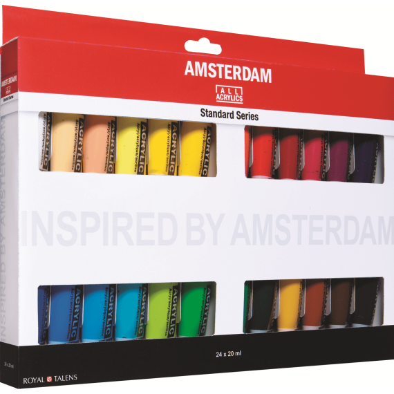 В наборе 24 тубы по 20мл, цвета: 105-223-224-267-275-269-311-315-318-369-567-568-504-572-564-522-617-618-619-623-227-411-409-735 (соответствуют цветовой гамме акрила Amsterdam Standard).