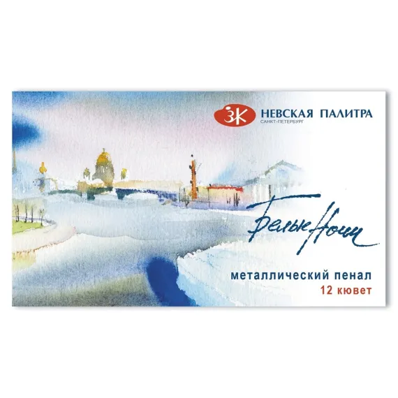 Состав набора акварельных красок «Белые ночи» разрабатывался совместно с известным художником – акварелистом Еленой Базановой. В палитре из 12 цветов присутствуют как базовые оттенки, так и новинки – бестселлеры 2019 года, которые оптимально подобраны для живописи и скетчей на пленэрах, когда ограниченная палитра должна помещаться в компактный пенал. Набор представлен в металлическом пенале с откидной палитрой и надежными держателями кювет во время работы и транспортировки. Оснащен кольцом для удобной фиксации в руке, чтобы работать на весу.