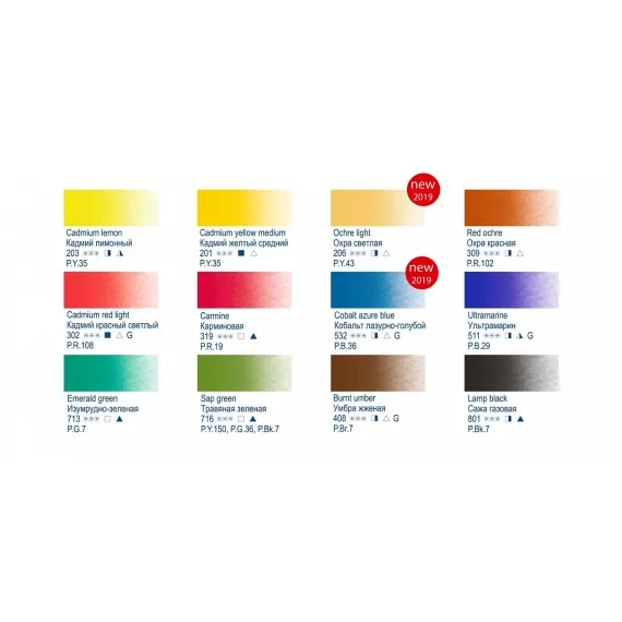 Высокая концентрация пигмента обеспечивают максимальную интенсивность цветового тона акварели. Насыщенность сохраняется даже при разбавлении большим количеством воды. Отличаются прозрачностью, что дает возможность художнику работать тонкими лессировками. Чистые цвета позволяют писать в смесях и получать богатое многообразие оттенков. Основная часть красок обладает высочайшим показателем светостойкости, что способствует сохранности работ свыше 100 лет. Все это обеспечивает их высокое качество и возможность использования в ответственных работах.