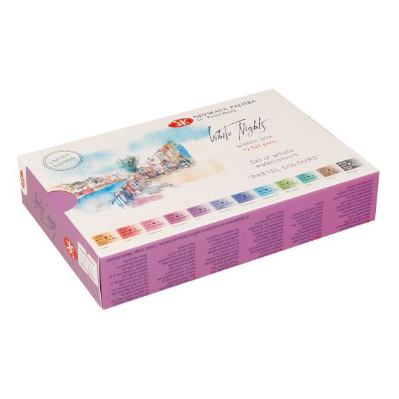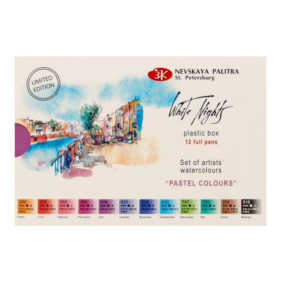 Профессиональные художественные акварельные краски «Белые ночи» представляют собой тонкодисперсные суспензии пигментов и наполнителей в связующем, в состав которого входит водный раствор растительного клея – гуммиарабика. Все акварельные краски в палитре «Белые ночи» безопасны, сертифицированы и соответствуют стандартам ASTM D-4236. Высокая концентрация пигмента обеспечивают максимальную интенсивность цветового тона акварели. Насыщенность сохраняется даже при разбавлении большим количеством воды. Отличаются прозрачностью, что дает возможность художнику работать тонкими лессировками. Чистые цвета позволяют писать в смесях и получать богатое многообразие оттенков. Основная часть красок обладает высочайшим показателем светостойкости, что способствует сохранности работ свыше 100 лет. Все это обеспечивает их высокое качество и возможность использования в ответственных работах. Цветовая гамма набора состоит из 12 нежных пастельных оттенков. Все краски линейки пастельных цветов являются укрывистыми, т. к. производятся на основе корпусных титановых белил P.W.6. Полипигментные краски чистых оттенков представляют собой готовые «колера» для различных живописных задач.