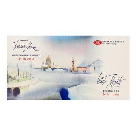 Профессиональные художественные акварельные краски «Белые ночи» представляют собой тонкодисперсные суспензии пигментов и наполнителей в связующем, в состав которого входит водный раствор растительного клея – гуммиарабика. Все акварельные краски в палитре «Белые ночи» безопасны, сертифицированы и соответствуют стандартам ASTM D-4236. Высокая концентрация пигмента обеспечивают максимальную интенсивность цветового тона акварели. Насыщенность сохраняется даже при разбавлении большим количеством воды. Отличаются прозрачностью, что дает возможность художнику работать тонкими лессировками. Чистые цвета позволяют писать в смесях и получать богатое многообразие оттенков. Основная часть красок обладает высочайшим показателем светостойкости, что способствует сохранности работ свыше 100 лет. Все это обеспечивает их высокое качество и возможность использования в ответственных работах. Сбалансированная палитра набора «Белые ночи» состоит из 24 цветов, позволяющих решить множество творческих задач акварелиста. Набор представлен в пластиковом пенале со съемной палитрой. При необходимости в пустых нишах пенала можно разместить до 12 дополнительных цветов.