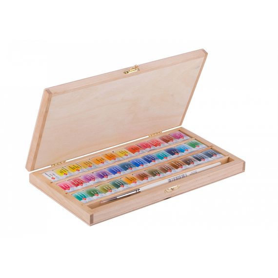 Подарочный набор «Белые ночи» в деревянном пенале из натуральной березы порадует мастеров и любителей акварельной живописи высоким качеством и возможностью применения в ответственных работах. Профессиональные художественные акварельные краски «Белые ночи» представляют собой тонкодисперсные суспензии пигментов и наполнителей в связующем, в состав которого входит водный раствор растительного клея – гуммиарабика. Все акварельные краски серии безопасны, сертифицированы и соответствуют стандартам ASTM D-4236. Высокая концентрация пигмента обеспечивают максимальную интенсивность цветового тона акварели. Насыщенность сохраняется даже при разбавлении большим количеством воды. Отличаются прозрачностью, что дает возможность художнику работать тонкими лессировками. Чистые цвета позволяют писать в смесях и получать богатое многообразие оттенков. Основная часть красок обладает высочайшим показателем светостойкости, что способствует сохранности работ свыше 100 лет. Традиционный состав набора «Белые ночи» из 36 цветов наиболее полно раскрывает потенциал живописных приемов и техник акварели. В комплектацию набора также входит кисть из натурального волоса белки.