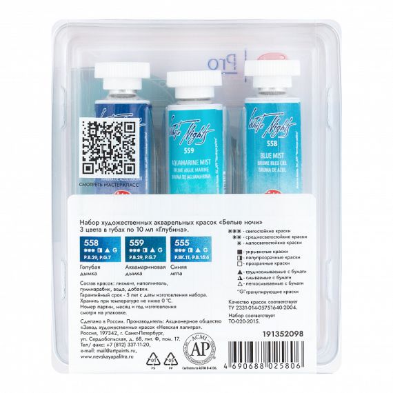Белые Ночи Набор акварельных красок 3цв 10мл Глубина тубы пластик