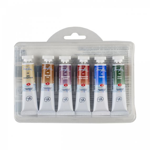 В наборе 6 туб по 10 мл. в сбалансированной цветовой палитре: охра петербургская, желтый туф, гематитовая дымка, железо-окисная светло-красная, голубая, окись хрома.