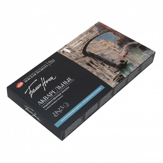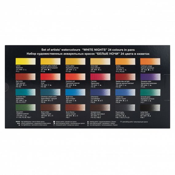 Акварель «Белые ночи» - краски, выпускаемые в полусухом виде в кюветах по 2,5 миллилитров. Акварель «Белые ночи» изготовлена из высококачественных тонко тертых пигментов и связующего с добавлением гуммиарабика. Цвета хорошо смешиваются между собой и легко размываются водой. Краска обладает высокой светостойкостью.