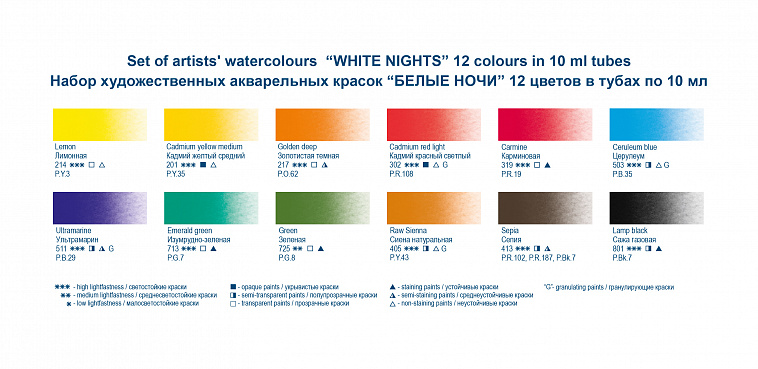 Художественные акварельные краски «Белые ночи» изготавливаются из тонкотертых пигментов и связующего из натурального гуммиарабика, признанного лучшим растительным клеем для приготовления художественных водных красок.Максимальная интенсивность цветового тона акварели, сохраняющаяся даже при разбавлении большим количеством воды, достигается благодаря высокой концентрации пигмента и тонкости его перетира.