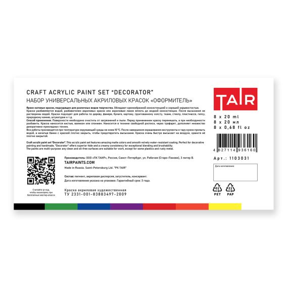 Tair Набор акриловых красок 20мл 8цв Оформитель
