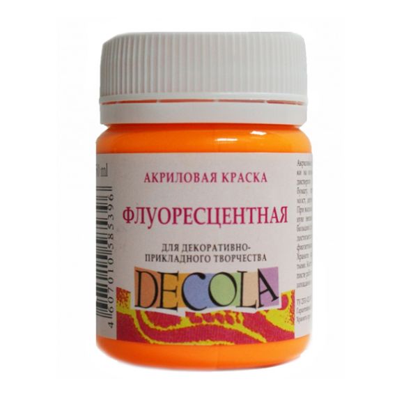 Флуоресцентная акриловая краска «Decola» изготовлена на основе водной акриловой дисперсии с добавлением большого количества пигментов. Краска универсальна в применении, хорошо наносится на бумагу, картон, грунтованный холст, кожу и другие поверхности. Максимальная степень флуоресцирования достигается при ультрафиолетовом освящении.