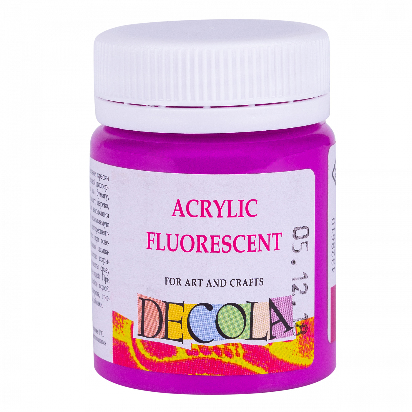 Флуоресцентная акриловая краска «Decola» изготовлена на основе водной акриловой дисперсии с добавлением большого количества пигментов. Краска универсальна в применении, хорошо наносится на бумагу, картон, грунтованный холст, кожу и другие поверхности. Максимальная степень флуоресцирования достигается при ультрафиолетовом освящении.