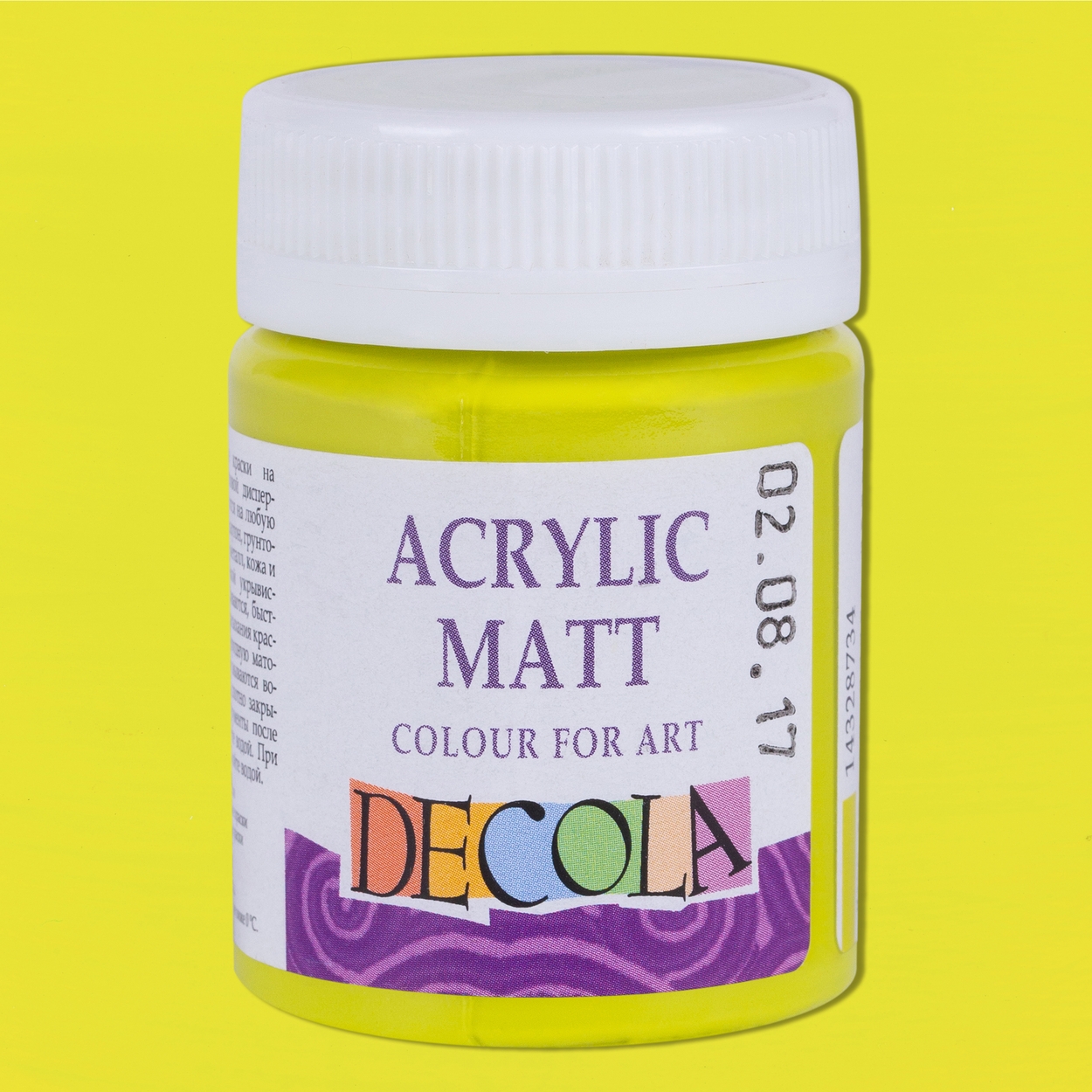 Акрил Decola это современная акриловая краска для декоративного творчества. Палитра матового акрила Decola постоянно расширяется, на сегодняшний день в ней представлено около 30 различных цветов, которые выпускаются поштучно в банках по 50 и 20 миллилитров и в наборах различной комплектации.