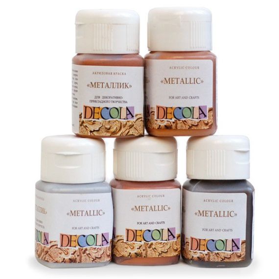 Акриловые краски «металлик» серии DECOLA - имитирующие цвета металлов воднодисперсные быстро сохнущие краски, содержащие суспензию пигмента в акриловой полимерной эмульсии, Их можно разбавлять водой, но после высыхания они становятся водостойкими.
