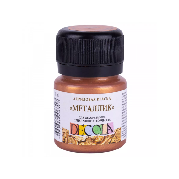 Акриловые краски «металлик» серии DECOLA - имитирующие цвета металлов воднодисперсные быстро сохнущие краски, содержащие суспензию пигмента в акриловой полимерной эмульсии, Их можно разбавлять водой, но после высыхания они становятся водостойкими.