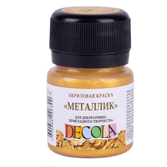 Акриловые краски «металлик» серии DECOLA - имитирующие цвета металлов воднодисперсные быстро сохнущие краски, содержащие суспензию пигмента в акриловой полимерной эмульсии, Их можно разбавлять водой, но после высыхания они становятся водостойкими.