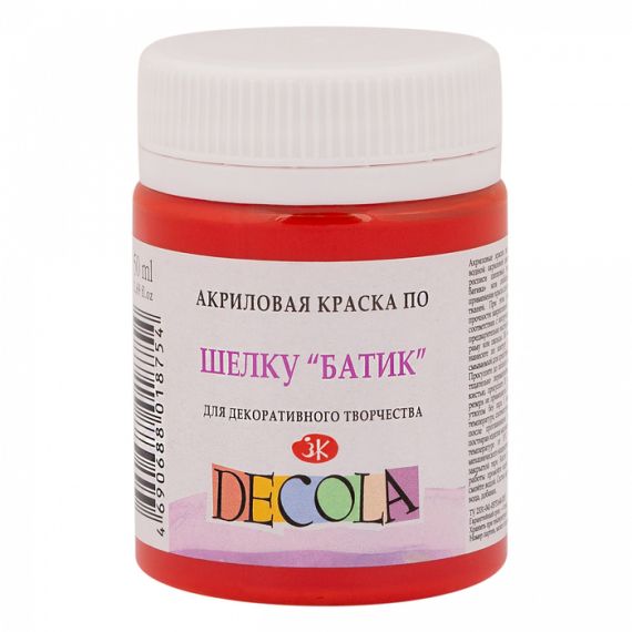 Акриловые краски по шелку «батик» серии DECOLA предназначены для различных типов натуральных и синтетических тонких тканей. Наносятся кистью непосредственно на ткань. Обладают хорошей растекаемостью. Краски глубоко проникают в волокна ткани, почти не уплотняя ее. Закрепляются горячим утюгом с изнаночной стороны. Быстро сохнут. Палитра состоит из 23 цветов.