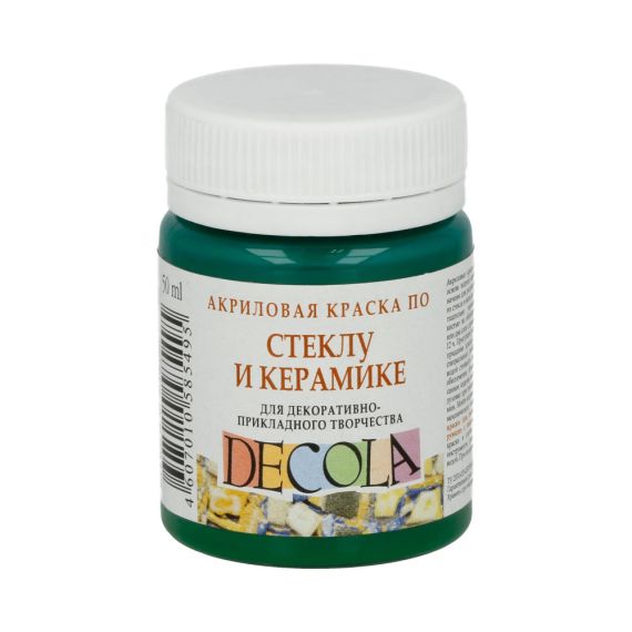 Акрил Decola является влагостойким, имеет хорошую светостойкость и обладает чистыми насыщенными цветами. Достоинство этой краски в том, что она не требует фиксации обжигом. Специально для этой серии разработан разбавитель акриловых красок по стеклу и керамике, который не только увеличивает прозрачность красок, но и сохраняет вязкость и устойчивость готовых изделий к воде. Краски очень популярны среди художников разных направлений.