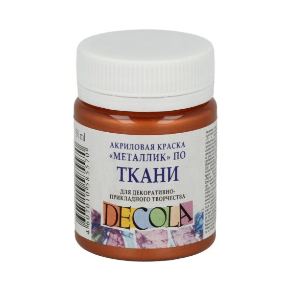Акрил по ткани Decola представлен широкой палитрой, в которой, помимо основных цветов, есть флуоресцентные, перламутровые и цвета металлики. Все цвета выпускаются в банках по 50 миллилитров и в различных наборах.