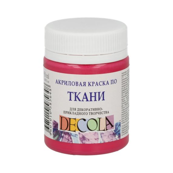 Акрил по ткани Decola представлен широкой палитрой, в которой, помимо основных цветов, есть флуоресцентные, перламутровые и цвета металлики. Все цвета выпускаются в банках по 50 миллилитров и в различных наборах.