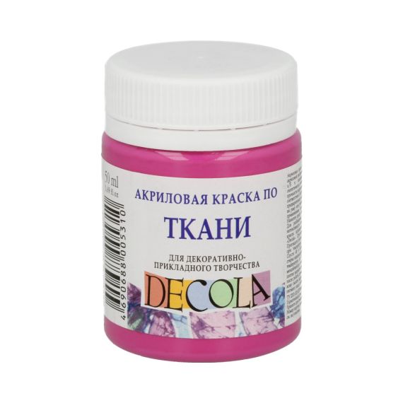 Акрил по ткани Decola представлен широкой палитрой, в которой, помимо основных цветов, есть флуоресцентные, перламутровые и цвета металлики. Все цвета выпускаются в банках по 50 миллилитров и в различных наборах.