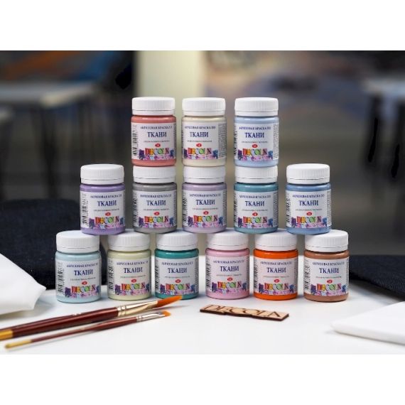 Акрил по ткани «Декола» представлен широкой палитрой, в которой, помимо основных цветов, есть флуоресцентные, перламутровые и цвета металлики. Все цвета выпускаются в баночках по 50 миллилитров и в различных наборах.