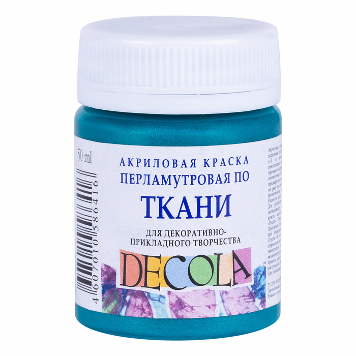 Акрил по ткани «Декола» представлен широкой палитрой, в которой, помимо основных цветов, есть флуоресцентные, перламутровые и цвета металлики. Все цвета выпускаются в баночках по 50 миллилитров и в различных наборах.