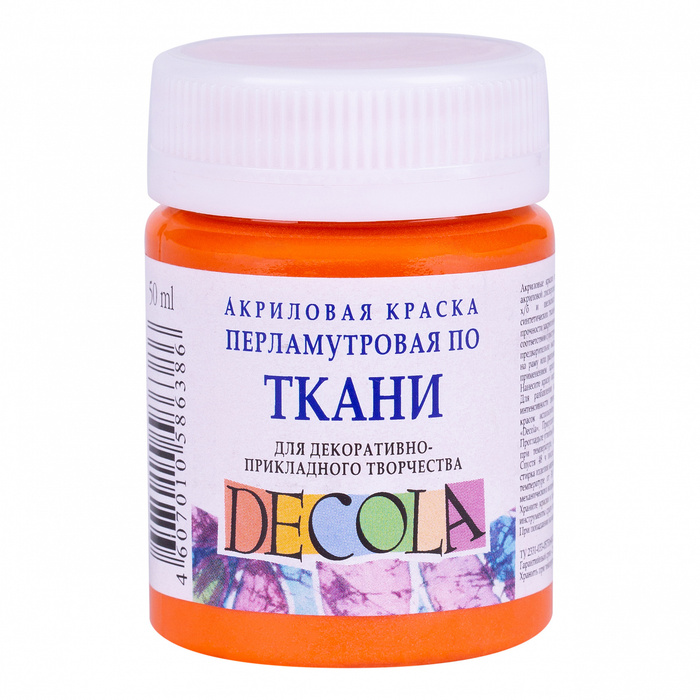 Акрил по ткани «Декола» представлен широкой палитрой, в которой, помимо основных цветов, есть флуоресцентные, перламутровые и цвета металлики. Все цвета выпускаются в баночках по 50 миллилитров и в различных наборах.