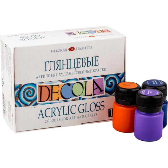 Глянцевые краски «Decola» на основе водной акриловой дисперсии легко наносятся на любую поверхность: бумагу, картон, грунтованный холст, дерево, металл, кожу и др.). Обладают высокой урывистостью, хорошо смешиваются, быстро высыхают. После высыхания приобретают глянцевый блеск, не смываются водой. Храните краски плотно закрытыми.