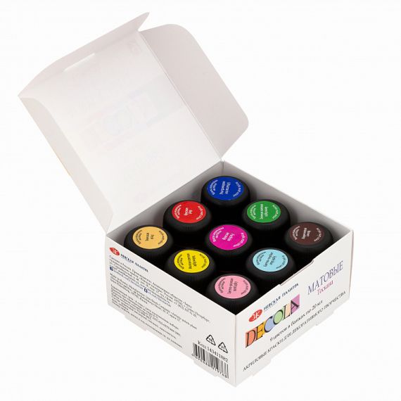 Матовые краски «Decola» на основе водной акриловой дисперсии легко наносятся на любую поверхность: бумагу, картон, грунтованный холст, дерево, металл, кожу и др.). Обладают высокой укрывистостью, хорошо смешиваются, быстро высыхают. После высыхания приобретают матовую поверхность, не смываются водой. Могут быть использованы для росписи специализированных поверхностей таких как ткань, кожа, пластик, металл, стекло или керамика. Для профессионального уровня росписи сложных поверхностей - гибких как ткань или гладких как стекло - рекомендуется использовать продукцию специализированных серий «Decola», обладающих лучшей адгезией с заявленными поверхностями. При работе с впитывающими и цветными поверхностями (например, деревом) перед нанесением красочного слоя также рекомендуется предварительно загрунтовать изделие белым акриловым грунтом «Сонет» в 1-3 слоя с промежуточной сушкой. Храните краски плотно закрытыми. Кисти и инструменты сразу после работы промойте водой.