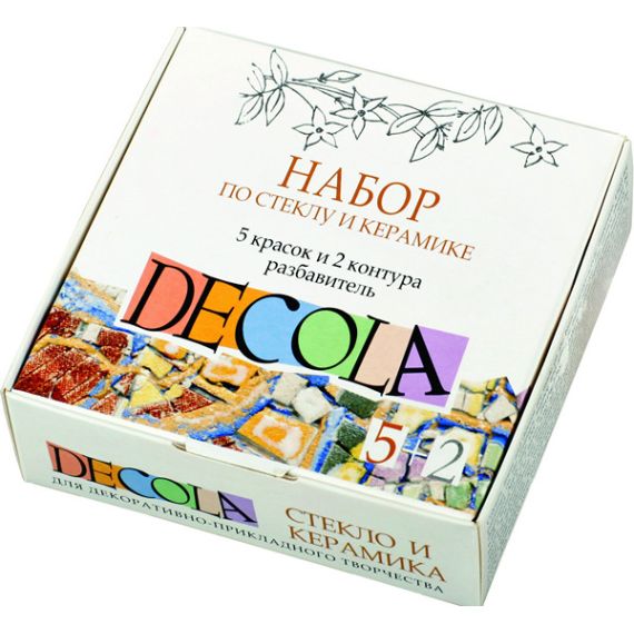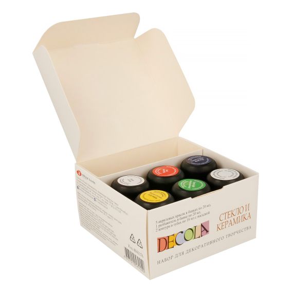 Акриловые краски по стеклу и керамике «Decola» на основе водной акриловой дисперсии предназначены для росписи керамики, фаянса, изделий из стекла и металла. Перед началом работы необходимо очистить поверхность изделия от пыли и тщательно обезжирить. Если планируется многоцветная роспись в несколько слоев, то начинать нужно с самого светлого оттенка. Промежуточная сушка между слоями краски составляет 12 ч. Для закрепления рисунка просушите роспись в течение 3 суток. Для продления срока службы расписанное изделие можно прогреть в духовке при температуре до 100°С в течение 30 минут или покрыть акриловым лаком. Кисти и инструменты сразу после работы промойте водой. Храните банки плотно закрытыми. Краска высыхает необратимо. При попадании на кожу смойте водой. После высыхания красок расписанное изделие можно мыть в теплой воде без сильного механического воздействия. Не используйте краски для росписи предметов, контактирующих с пищевыми продуктами.