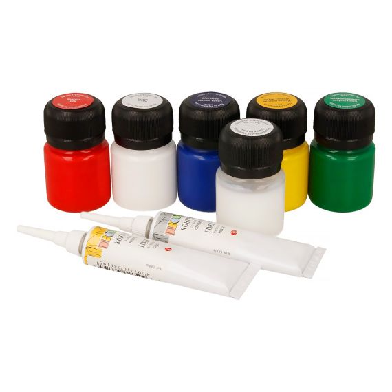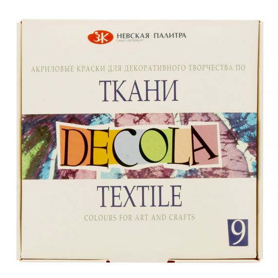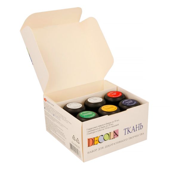 Акриловые краски по ткани «Decola» изготавливаются на основе водной акриловой дисперсии и образуют после высыхания прочную эластичную пленку на поверхности. Краски предназначены для росписи хлопчатобумажных и шелковых тканей. Допускается применение красок на синтетических тканях. При этом рекомендуется убедиться в прочности закрепления рисунка на образце ткани. Предварительно необходимо выстирать ткань без использования кондиционера, высушить и выгладить. Для росписи одежды рекомендуется положить полиэтилен или плотную бумагу внутрь, чтобы избежать отпечатывания краски на другой стороне изделия. Краски наносятся равномерно тонким слоем с помощью кисти, губки или валика. Для закрепления красок на ткани просушите роспись в течение 24 ч. Прогладьте утюгом без пара 5 мин через х/б ткань при температуре, соответствующей х/б ткани. Спустя 48 ч после проглаживания допускается стирка изделия мягкими моющими средствами при температуре от 30°С до 40°С без сильного механического воздействия.