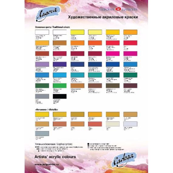 Для удобства пользователя цвета, созданные с заменой пигментов, обозначены на этикетке буквой «А» (аналог). Художественные акриловые краски «Ладога» имеют универсальное применение, они прекрасно подойдут как для художественных работ, так и для декоративных и дизайнерских. Краски хорошо ложатся на многие поверхности: бумагу, кожу, картон, холст, дерево, металл. Все цвета смешиваются между собой.