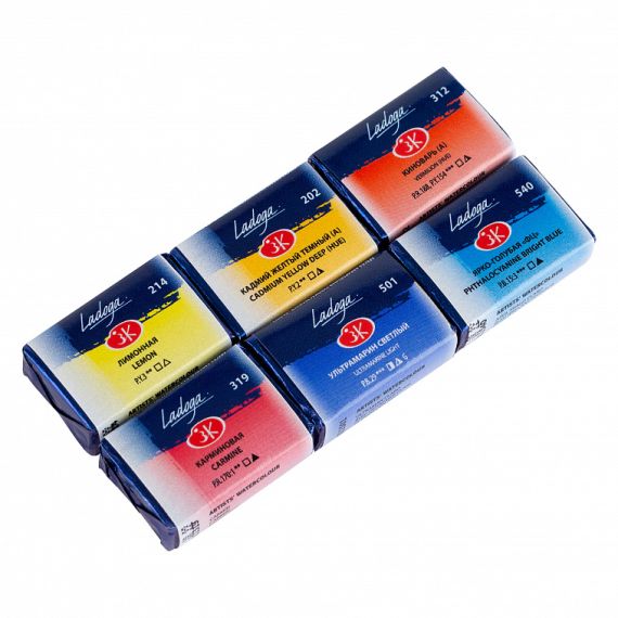 Тонкодисперсные акварельные краски «Ладога» выпускаются с применением современных синтетических пигментов и традиционного связующего - натурального гуммиарабика, признанного лучшей растительной смолой для приготовления художественных красок. Краски «Ладога» обладают яркими насыщенными цветами. Компактный набор из 6 цветов представлен в пластиковом коррексе.