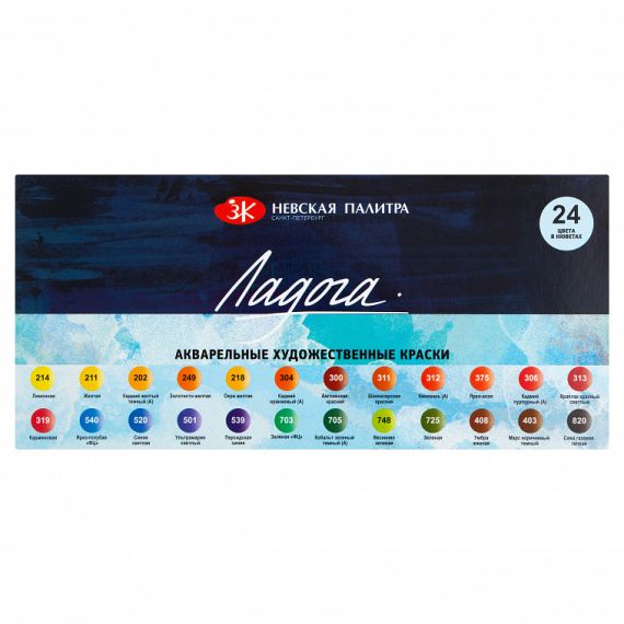 Художественные акварельные краски «Ладога» разработаны для решения творческих задач учащихся профессиональных образовательных учреждений. Рекомендованы для создания этюдов, эскизов, учебных работ. Краски «Ладога» выпускаются с применением синтетических пигментов и гуммиарабика.