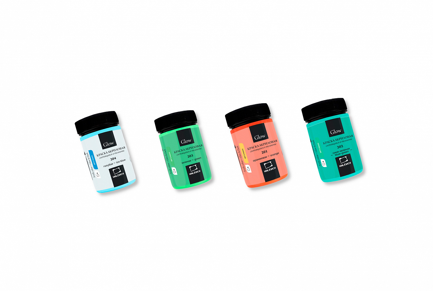 Главной особенностью акриловой краски Glow от бренда «Малевичъ» является то, что она светится в темноте. В остальном краски обладают всеми качествами акрила — мягкая текстура, которая позволяет наносить краску на бумагу, холст и другие поверхности, после высыхания образует прочную водоотталкивающую плёнку, хорошая укрывистость и яркие насыщенные цвета. С акрилом Glow вы можете экспериментировать, создавая отдельные детали в ваших работах или полноценные работы, которые будут раскрываться и играть новыми цветами в темноте.
