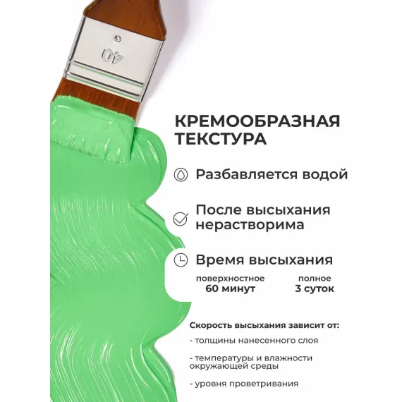 Акрил "Малевичъ" Matisso изготовлен из высококачественных натуральных пигментов с применением современных связующих веществ, благодаря чему он практически не имеет запаха, а яркие, насыщенные цвета имеют высокую светостойкость. Густая консистенция краски дает возможность художнику писать "пастозно", выделять объем, что отвечает потребностям последних тенденций живописи. Акрил хорошо разбавляется водой и подходит для росписи по любой поверхности. Также можно использовать его в технике "декупаж", росписи по ткани, дереву, металлу, камню или стеклу. При высыхании акрил образует водостойкую пленку, которая прочно закрепляется на поверхности. Акрил быстро сохнет, буквально через час работу можно покрывать лаком.