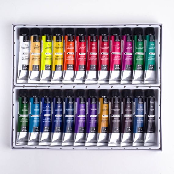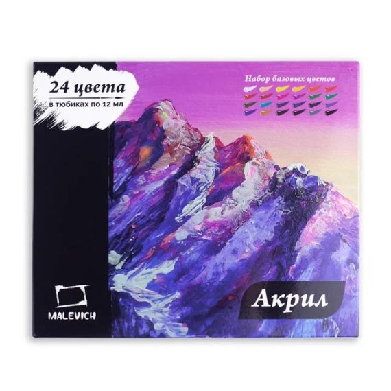 Акрил «Малевичъ» изготовлен из высококачественных натуральных пигментов с применением современных связующих веществ, благодаря чему он имеет яркие, насыщенные цвета имеют с высокой степенью светостойкости. Густая консистенция краски дает возможность художнику писать пастозно, выделять объем, что отвечает потребностям последних тенденций живописи. Акрил хорошо разбавляется водой и подходит для росписи по любой поверхности. Также можно использовать его в технике декупаж, росписи по ткани, дереву, металлу, камню или стеклу. При высыхании акрил образует водостойкую пленку, которая прочно закрепляется на поверхности. Акрил быстро сохнет, буквально через час работу можно покрывать лаком.