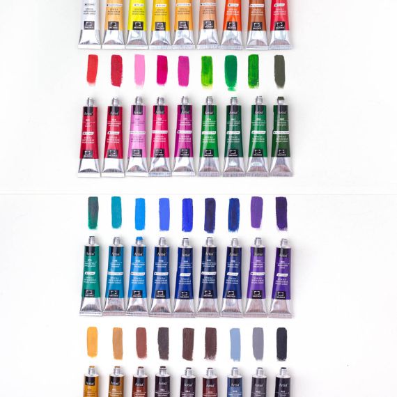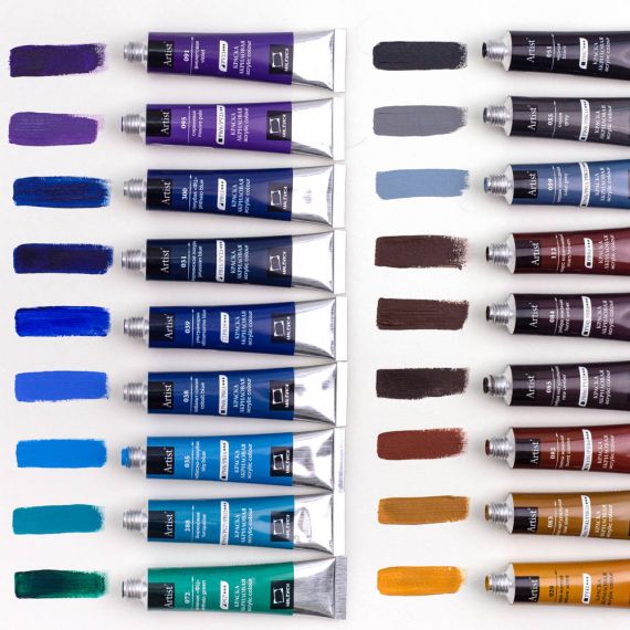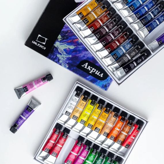 Акрил «Малевичъ» изготовлен из высококачественных натуральных пигментов с применением современных связующих веществ, благодаря чему он имеет яркие, насыщенные цвета имеют с высокой степенью светостойкости. Густая консистенция краски дает возможность художнику писать пастозно, выделять объем, что отвечает потребностям последних тенденций живописи. Акрил хорошо разбавляется водой и подходит для росписи по любой поверхности. Также можно использовать его в технике декупаж, росписи по ткани, дереву, металлу, камню или стеклу. При высыхании акрил образует водостойкую пленку, которая прочно закрепляется на поверхности. Акрил быстро сохнет, буквально через час работу можно покрывать лаком.