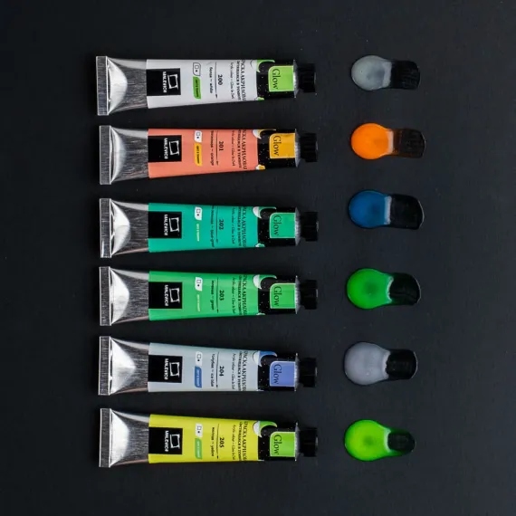 Главной особенностью акриловой краски Glow от бренда «Малевичъ» является то, что она светится в темноте. В остальном краски обладают всеми качествами акрила — мягкая текстура, которая позволяет наносить краску на бумагу, холст и другие поверхности, после высыхания образует прочную водооталкивающую плёнку, хорошая укрывистость и яркие насыщенные цвета. С акрилом Glow вы можете экспериментировать, создавая отдельные детали в ваших работах или полноценные работы, которые будут раскрываться и играть новыми цветами в темноте.