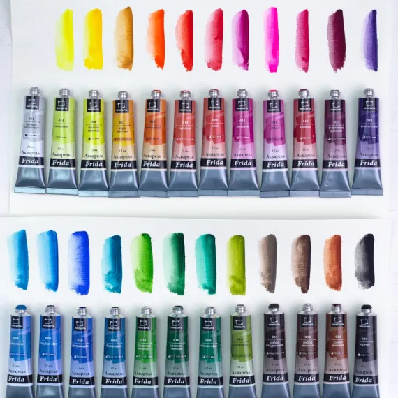 Коллекция акварели Frida от «Малевичъ» разработана совместно с российскими художниками. В состав красок входит натуральный гуммиарабик, который признан лучшим связующим для акварели, пигмент и коалин. При производстве используются экологически чистые материалы. Яркие, насыщенные и светостойкие пигменты гарантируют отличную сохранность готовых работ. Линейка представлена акварелью в тубах по 12 мл. поштучно и в наборах различной комплектации. Состав набора и выкраску цветов вы можете посмотреть в дополнительном фото.