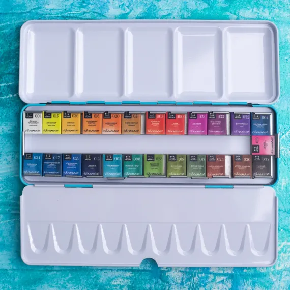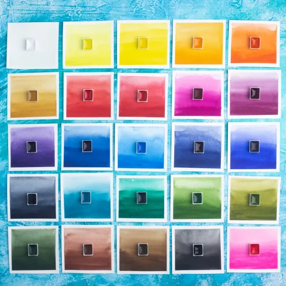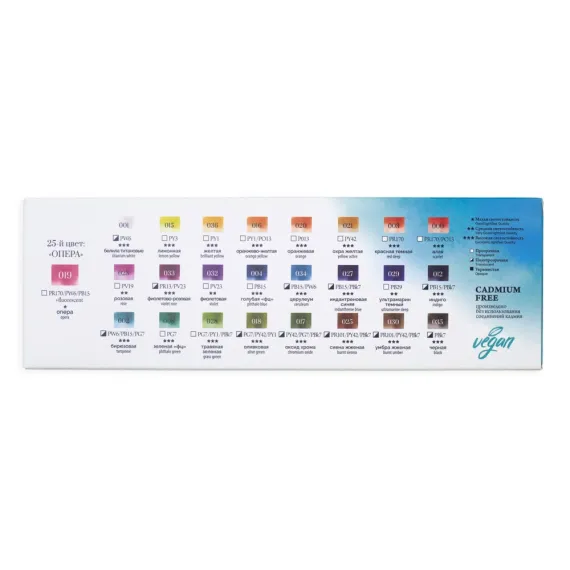 Акварель создана без использования соединений кадмия и животных компонентов. В наборе 25 цветов.