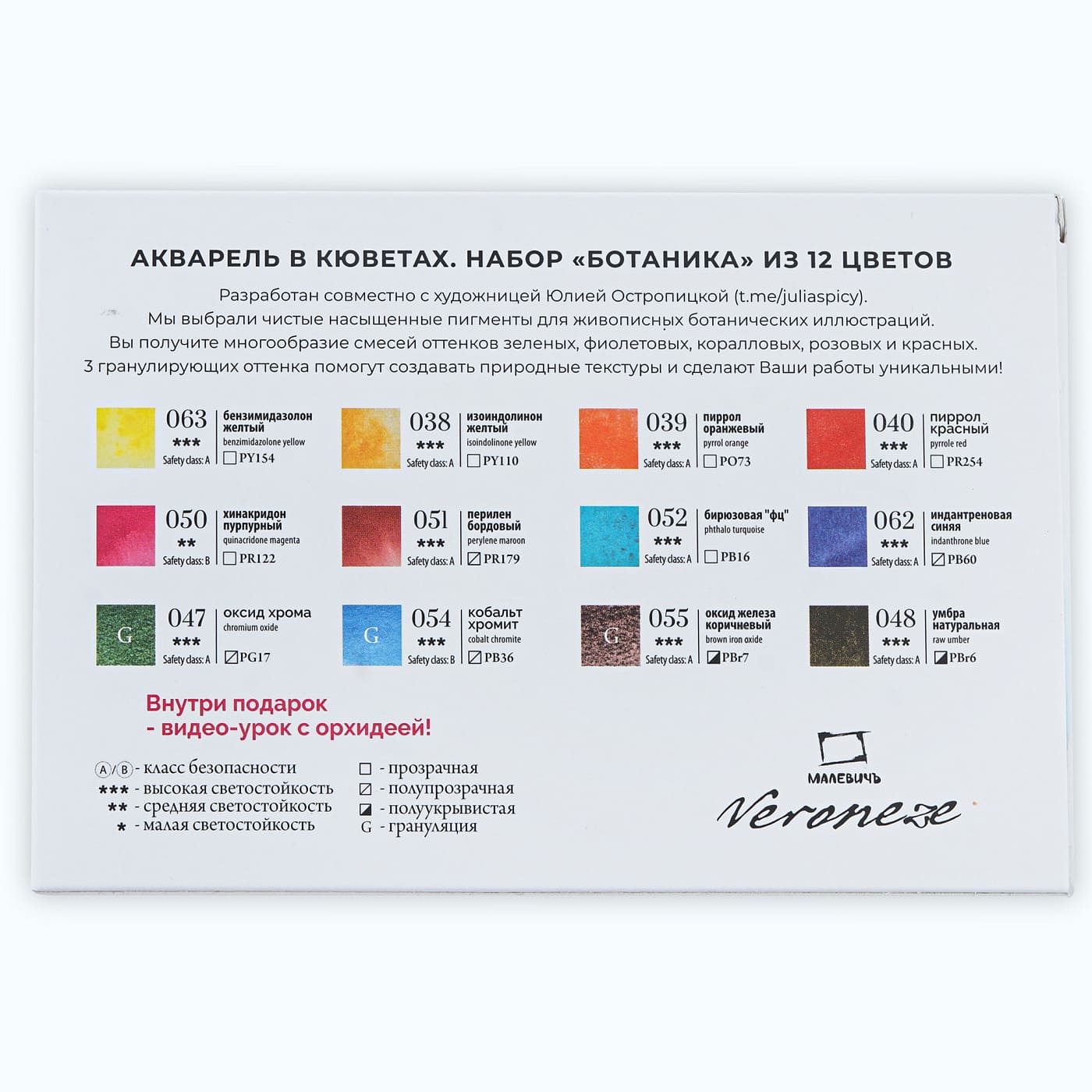 Набор включает 12 цветов, подобранных совместно с художницей Юлией Остропицкой. Благодаря новой формуле краски не жухнут на бумаге, не проседают, а замесы будут чистыми и яркими. Акварель «Малевичъ» подойдет как новичкам, так и профессионалам. Высококачественные насыщенные пигменты позволят создать живописные ботанические иллюстрации. Цветовая палитра оттенков от классических до гранулирующих позволит расширить ваш творческий путь, захочется творить и творить, делая замесы и получая новые неповторимые цвета. Благодаря однопигментности акварель легко смешивается, предоставляя бесконечную возможность для новых замесов без грязи. Цвета в наборе отлично сочетаются друг с другом и позволят экспериментировать в разных техниках. Насыщенность каждой краски оживит ваши работы и сделает их по-настоящему уникальными.