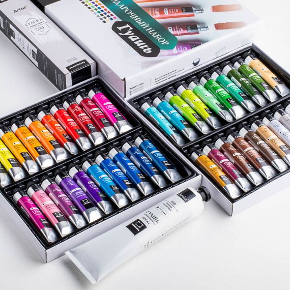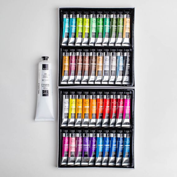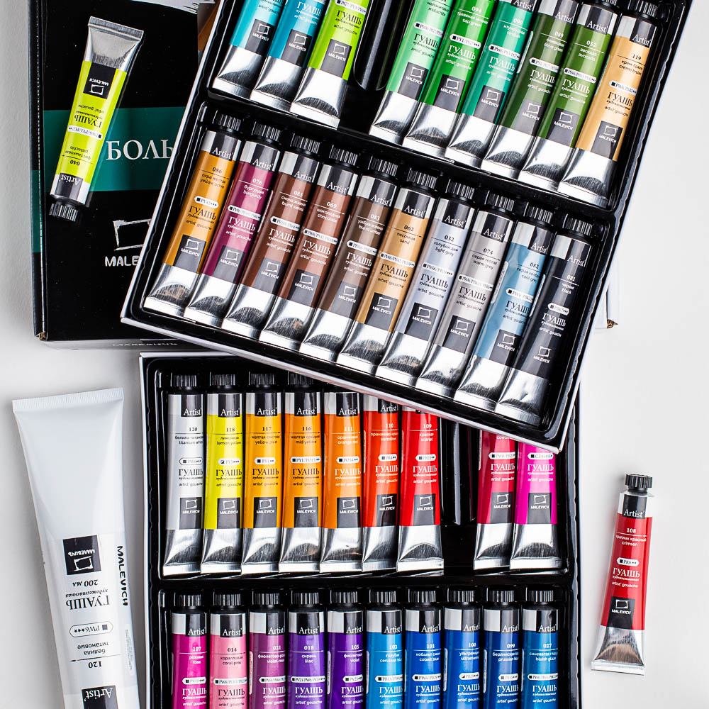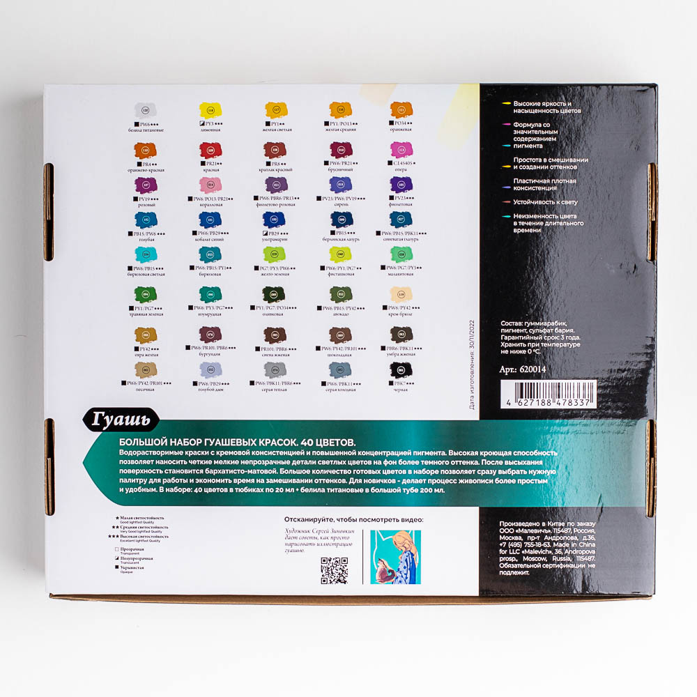Гуашь «Малевичъ» — это водорастворимая, комфортная для работы краска с приятной кремовой консистенцией и повышенной концентрацией пигмента. Высокая кроющая способность позволяет наносить четкие мелкие непрозрачные детали светлых тонов на фон темного оттенка. Краски отлично ложатся, имеют яркие, насыщенные цвета. После высыхания поверхность становится бархатисто-матовой. Подходит как для начинающих художников, так и для профессионалов. Серия гуаши в тубах представлена поштучно и в наборах различной комплектации. В наборе 40 туб разных цветов по 20 мл и банка белил 200 мл.