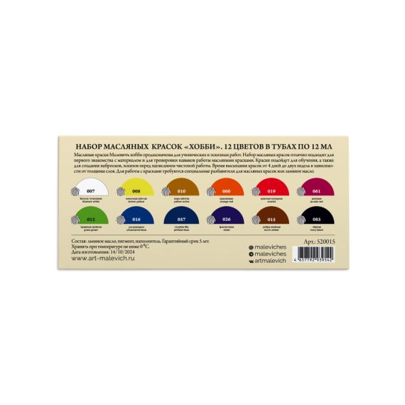 Краски серии "Хобби" - недорогой вид красок для тех, кто только начинает творить. Подходит для детского творчества, хобби, декоративных работ. Отлично подойдут для первого знакомства с материалом и для тренировки навыков работы с красками. Позволяют попробовать себя в различных техниках и фактурах, работы с трафаретами и картин по номерам. В наборе "Малевичъ хобби" 12 тюбиков масляной краски базовых цветов по 12 мл