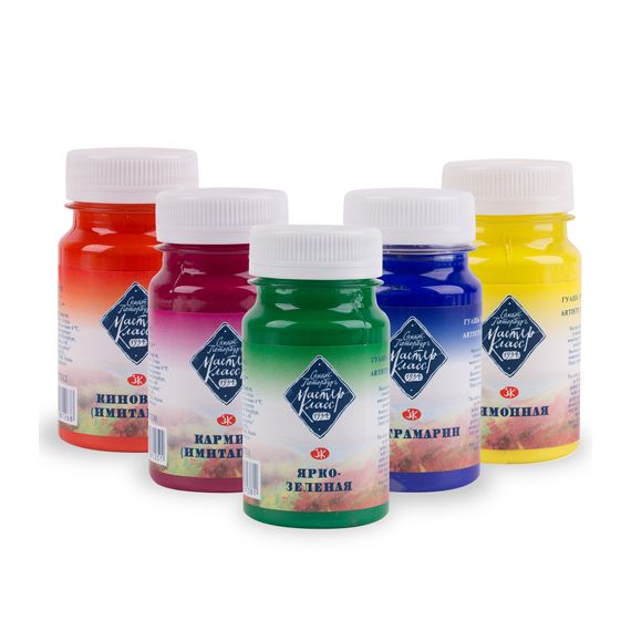 Гуашь «Мастер-класс» изготавливается по старинной рецептуре из тонко тертых пигментов с добавлением гуммиарабика в качестве связующего. Гуашь «Мастер-класс» обладает высокой укрывистостью, разбавляется водой. Все цвета отлично смешиваются между собой, что позволяет получить новые цвета и оттенки. После нанесения гуашь имеет характерный матовый оттенок и бархатистость.