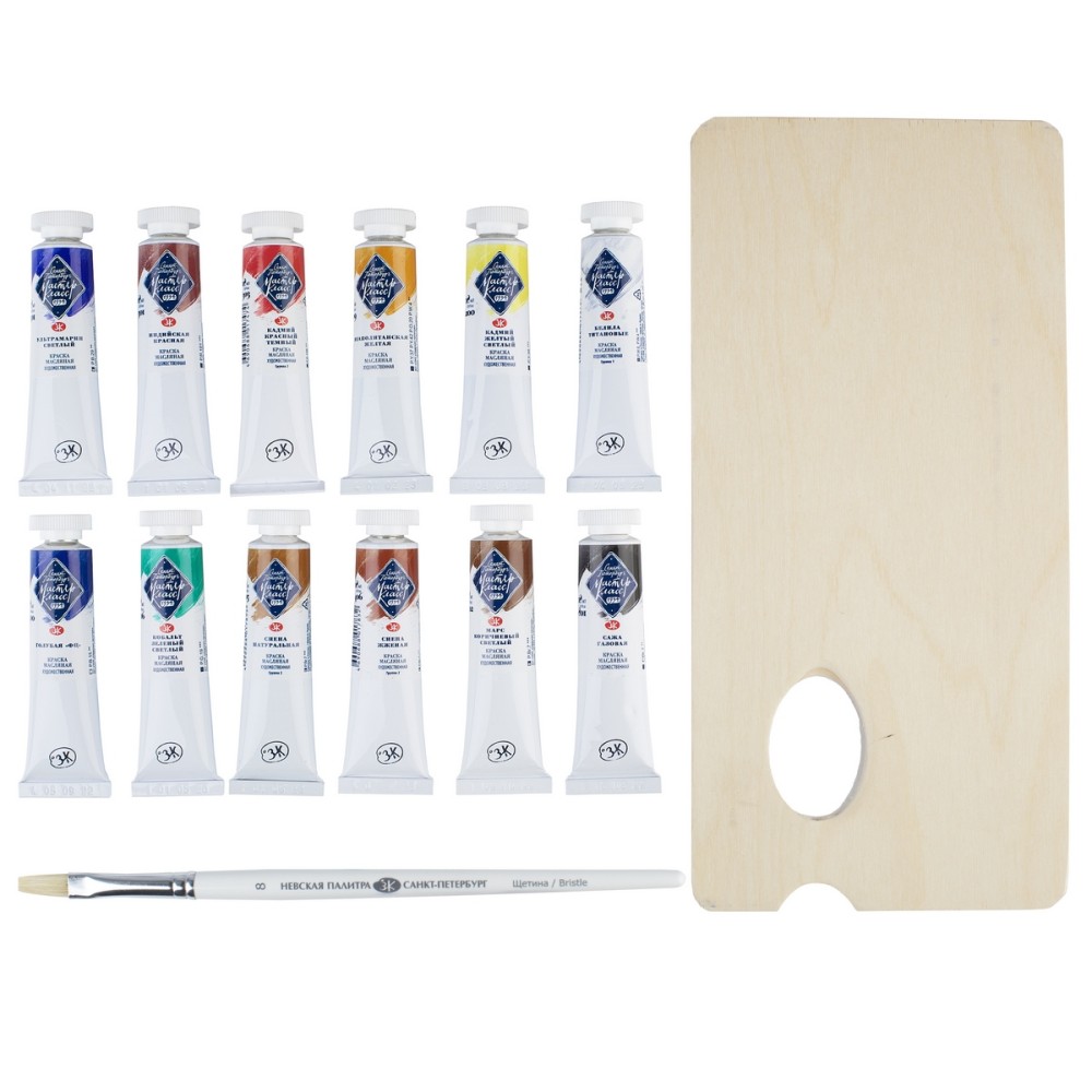 Масляные краски «Мастер-Класс» разработаны для профессиональных художников. Изготавливаются по традиционным рецептурам на основе высококачественных пигментов, связующего – специально обработанного льняного масла и натуральных смол, положительным образом влияющих на свойства красок. Тонкодисперсные краски с высокой концентрацией пигмента превосходно смешиваются между собой. Обладают густой консистенцией, позволяющей работать пастозно. Яркость и чистота цвета, высокая светостойкость красок обусловлены применением ценных для живописи неорганических (природные красящие земли, синтетические кадмиевые, кобальтовые, железоокисные) и органических пигментов высокого качества. Сбалансированная палитра из 12 цветов в наборе позволяет решить множество творческих задач художника. Набор дополнен кистью и представлен в синем деревянном пенале.