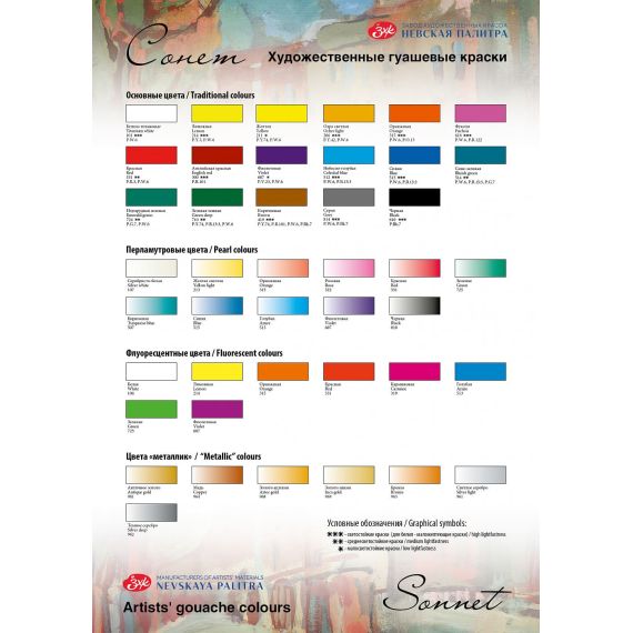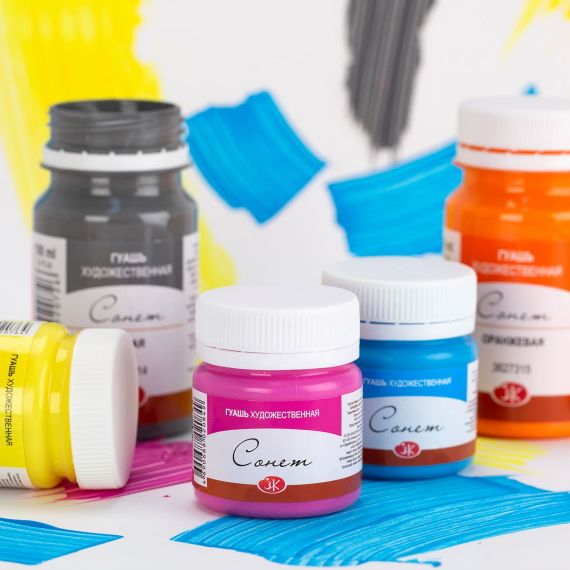 Гуашь «Сонет» широко используется для художественных и дизайнерских работ. Отлично подходит для детского творчества. В отличие от используемых при изготовлении профессиональной гуаши пигментов и гуммиарабика как связующего, в рецептуре гуаши «Сонет» использованы пигментные пасты и синтетическое связующее. Гуашь «Сонет» хорошо ложится на бумагу и картон. При необходимости разбавляется водой и легко размывается. После высыхания приобретает бархатистый матовый оттенок.