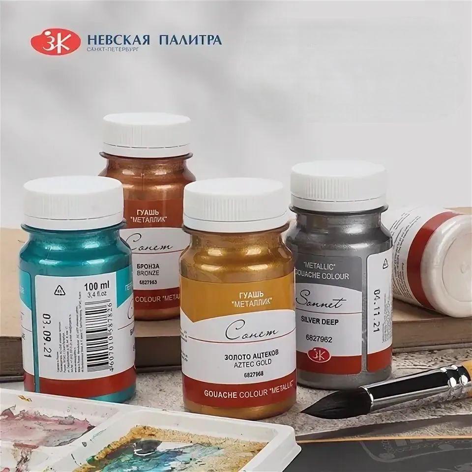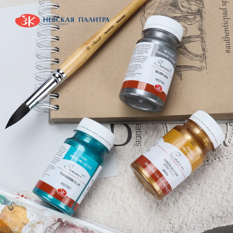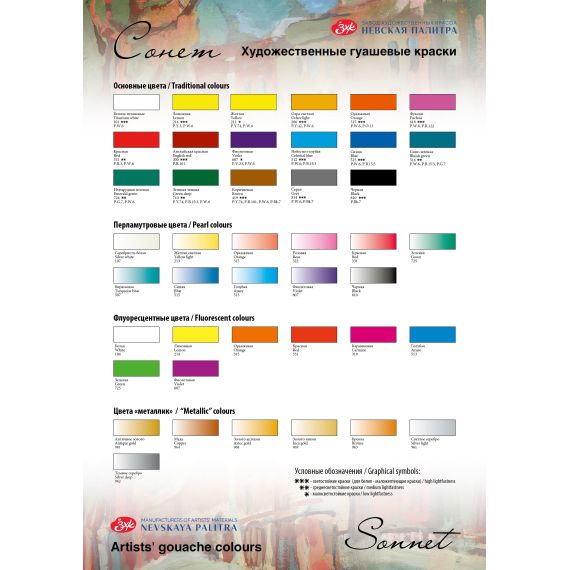 В отличие от профессиональной гуаши, в красках серии «Сонет» используются не пигменты, а пигментные пасты. В состав связующих гуаши этой серии не входит гуммиарабик – вместо него использовано синтетическое связующее. Краски легко смешиваются друг с другом и с белилами, создают новые чистые цвета, легко размываются водой. После высыхания краска приобретает матовую текстуру.