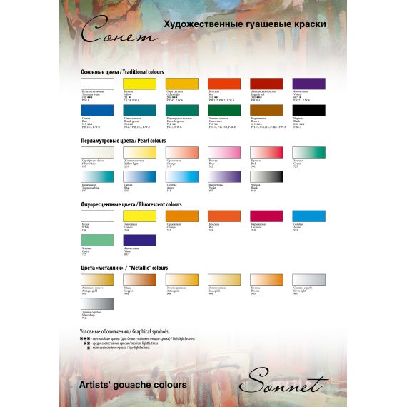 Далеко не каждый производитель может похвастаться наличием перламутровых или флуоресцентных цветов. Завод Невская палитра дополнил красоту и практичность гуашевой краски различными эффектами и создал дополнительно к серии «Сонет» перламутровую гуашь, флуоресцентную гуашь и гуашь цвета «металлик».